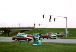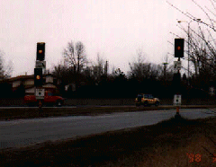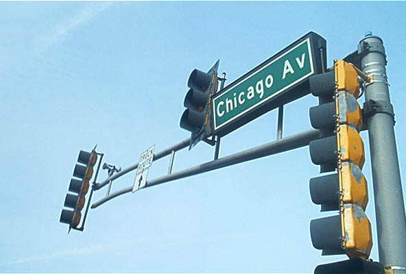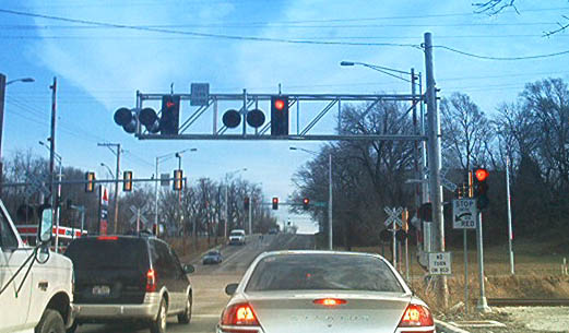 ILLINOIS- This is an example of a signal installation in Illinois. It shows the basic color scheme of a yellow housing with black visors and doors. Note that the elevator plumbizer (attaching hardware from signal to pole) is between the yellow and green sections. This is unusual because it makes the signal a bit top heavy. Typically signals are mounted between the red and yellow sections on a typical three light unit. (Photo by Kurt Gros)