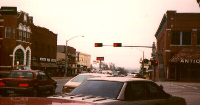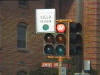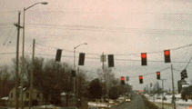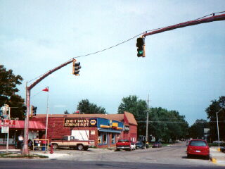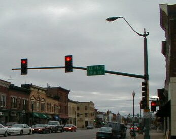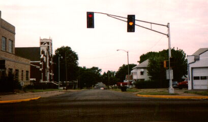 IOWA- This particular example is kind of a famous one as well. This older signal installation is in Winterset, Iowa and was used in the "rainy scene" in the movie "The Bridges of Madison County". This was typical of the older signals in Iowa. Most were made by either Eagle Signal or Crouse-Hinds, and some had the larger 12" red section. This particular intersection is still controlled by a Crouse-Hinds electro-mechanical controller.