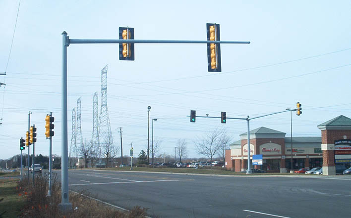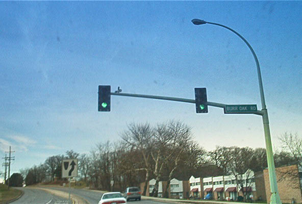 Another view, showing the back of a typical Illinois installation. Note the use of Astro-brac devices for mounting the signal to the mast arm