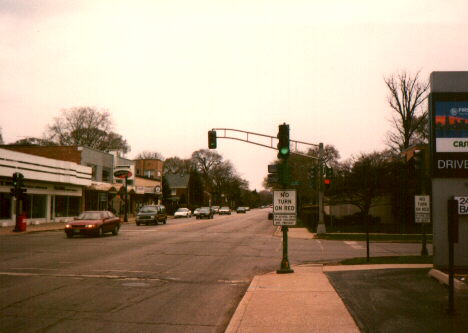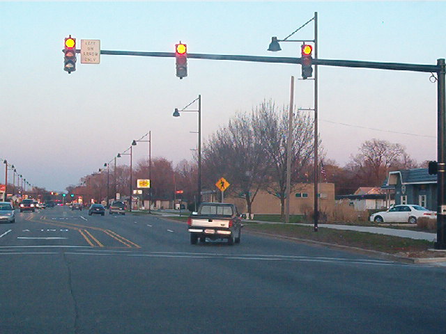 The intersection uses single left turn lanes for Main Street, with protected left turns (green & yellow arrow only). Wisconsin intersections are beginning to use infra-red cameras for vehicle detection (mounted on 'streetlight' type poles). Some intersections also use a system that gives emergency vehicles a green light by using radio fequencies (the detector and floodlight are hung in the cross-arms of the horizontal signals). (Above two photos by Eric Frailing)