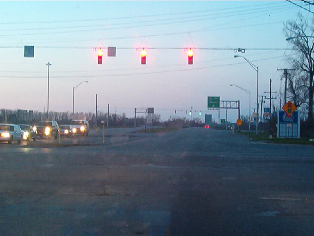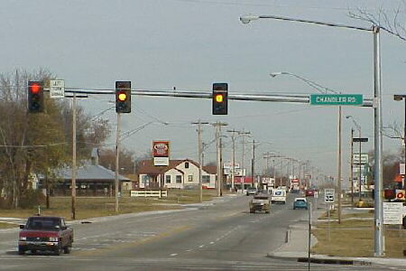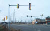 INDIANA- The next three pictures show examples of Indiana's signal installations. This first example is of the mono-tube mast-arm installation. All signals have been converted to LED indications.
