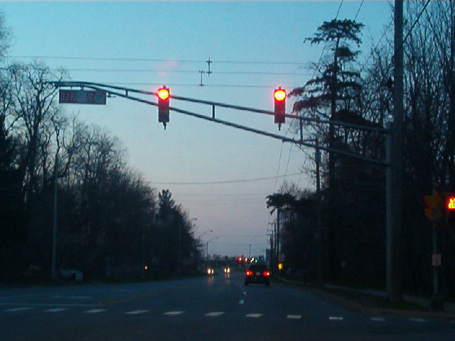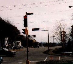 An odd looking custom mast arm assembly. Note the use of louvered back plates and the small white light on the mast to indicate emergency pre-empt clearence.