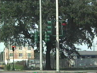 LOUISIANA- Louisiana uses truss style arms placed diagonally across the intersection, so as two control two 90 degree directions of traffic. They typically paint their signals green and still make use of "side-of-pole" mounted units as seen in the second photograph. (Photos by Alex Nitzman)