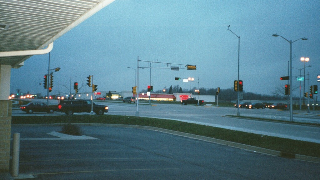 This view was taken at the intersection of Main Street & Paradise Drive in West Bend, WI. The intersection uses double left turn lanes for Paradise Drive, with protected left turns (green, yellow & red arrows). This type of left turn system is used more & more now in WI for turn lanes onto major highways