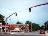 Another example of a Missouri installation. This particular span wire installation is in dire need of tensioning and tightening...note the "sagging wire". These span wire signals are quite common in the smaller towns and back country byways of the state. The signals here were manufactured by Eagle. (Photo by Christopher Knight)